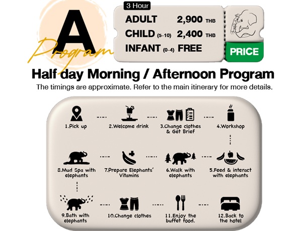 | Bangkok Elephant Park | 一日遊行程含接送 – Full‑Day Morning Program (Free Transfer), 半日行程下午梯次 – HALF DAY AFTERNOON PROGRAM, 半日行程下午梯次含接送 – HALF DAY AFTERNOON PROGRAM WITH TRANSFER, 半日行程早上梯次 – HALF DAY MORNING PROGRAM, 半日行程早上梯次含接送 – HALF DAY MORNING PROGRAM WITH TRANSFER |