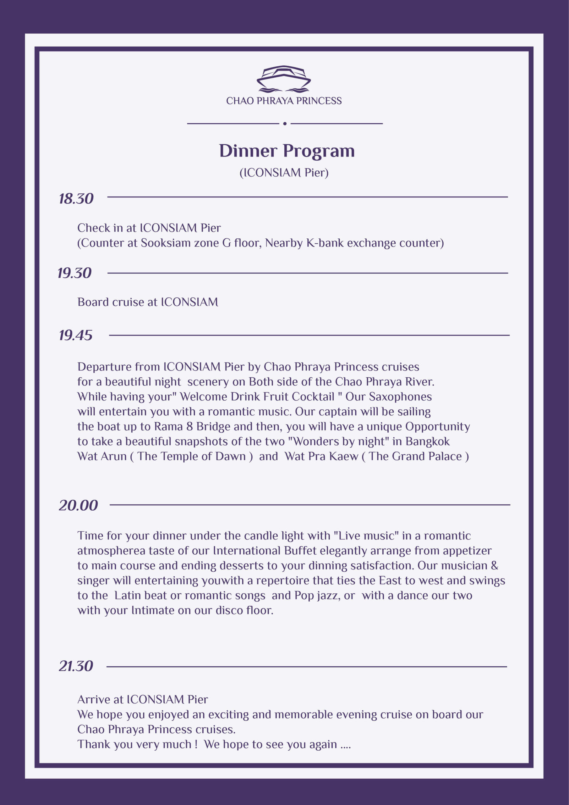 | princess cruise | 公主号邮轮日落自助餐(Asiatique码头) 17:00, 公主号邮轮自助晚餐(Asiatique码头) 19:30, 公主号邮轮自助晚餐(ICONSIAM码头) 19:30, 公主号邮轮自助晚餐(ICONSIAM码头) 20:00 |